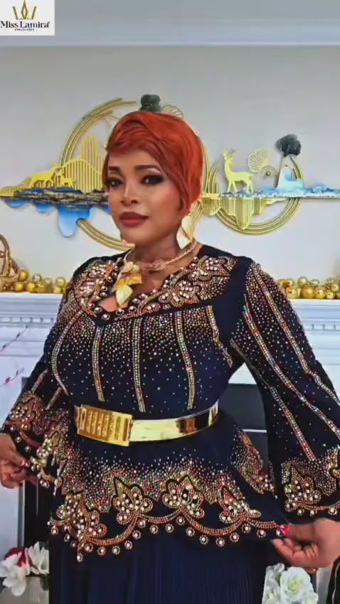 This elegant long dress features a beautifully embellished top with sparkling rhinestones that add refined glamour. The bodice is designed with flap-like pleats for a structured yet graceful look. Its long, flag-like sleeves enhance the sophisticated silhouette, making it ideal for formal occasions. Crafted from high-quality fabric, the dress offers both comfort and durability, ensuring you look polished and feel confident throughout any event.